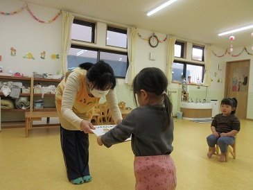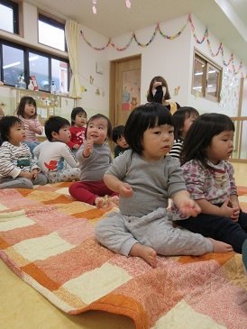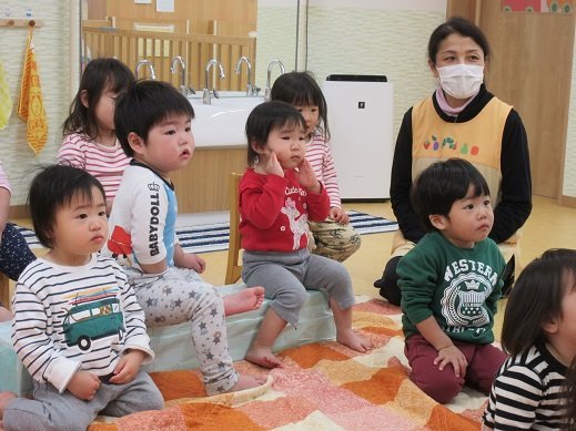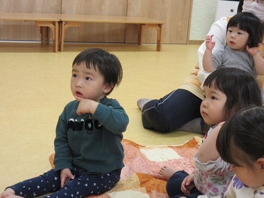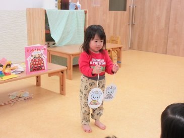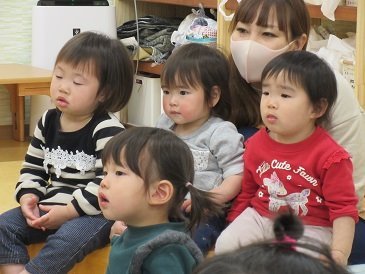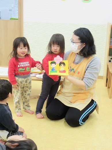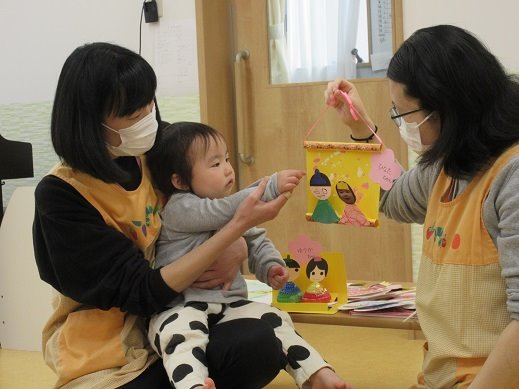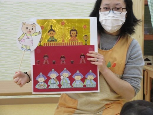 ひな祭りや菱餅の由来を聞いたり、絵本を読んでもらったり、作品のみせあいっこを