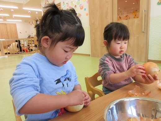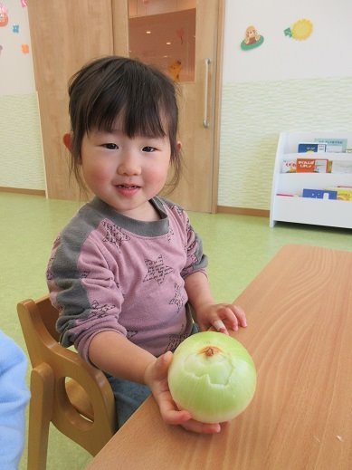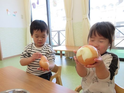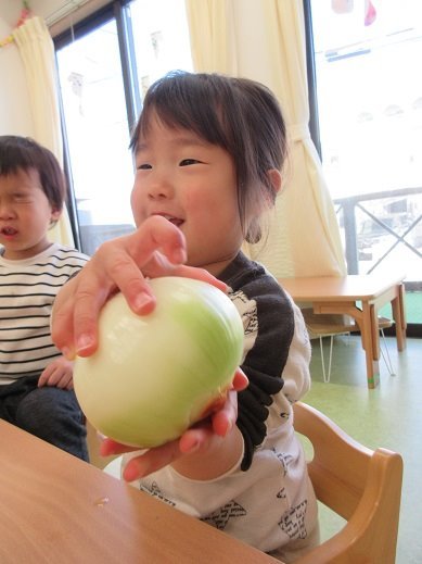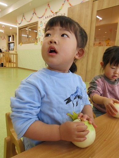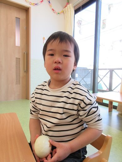 皮をむくと、玉ねぎの中がきれいにでてきたYちゃん。つるつる玉ねぎを見て、「なんか、りんごになったわ!」と気持ちよさそうに撫ぜ撫ぜヾ(・ω・*) (笑) 一生懸命にむいていたY君、「せんせー、なみだが…なみだが…」顔を上げると涙がポロポロ(´;ω;`)ウッ… 触らない約束をきちんと守って流れる涙を教えてくれましたよ。ティッシュで拭くと「ありがとう。」と言って、最後の最後まで涙と戦いながら綺麗にむいてくれました。