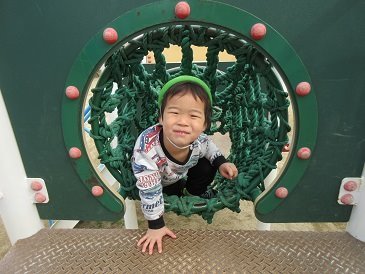 網トンネルをくぐったり、1本橋をそろりそろりと歩いたり、ロッククライミングをしたり、パワー全開!