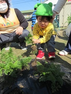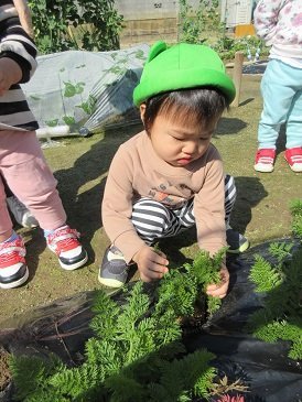 春の陽気に誘われて、きらきら畑の人参が土の中から、ひょっこり顔を出しました。