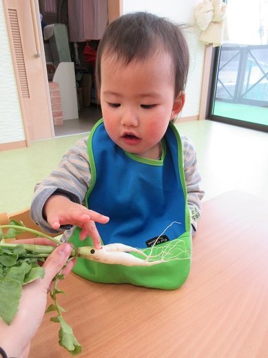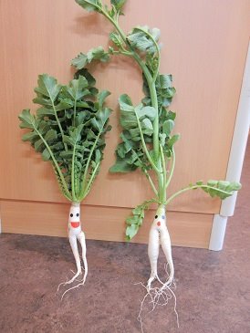 園のプランターで採れたミニ大根♪ 形が面白くて、ついついいたずら心が…