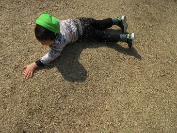 芝生の小さな山を見つけ、駆け下りて遊んでいたY君。