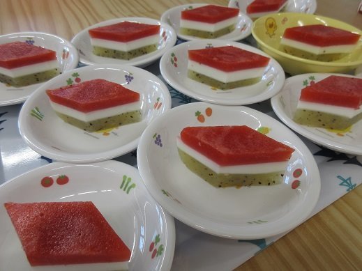 午後のおやつは、菱餅に見立てた3色ゼリー。