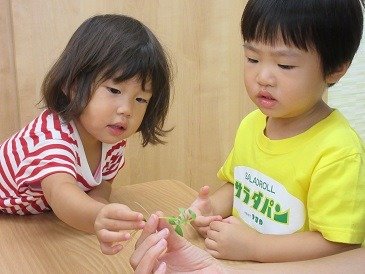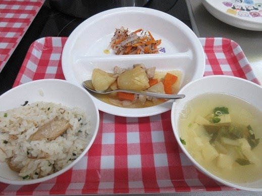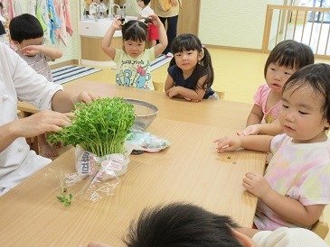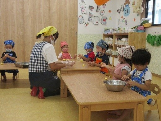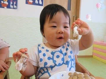 ・給食準備のお手伝い(しめじの房分けなど)や、2歳児のクッキング