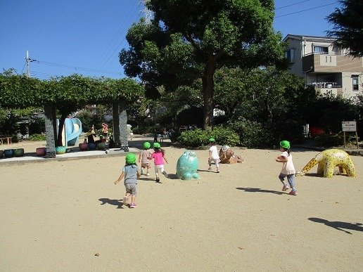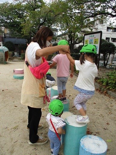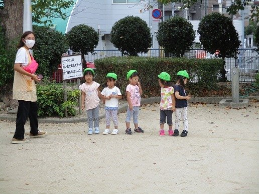 公園では、1列に並んで