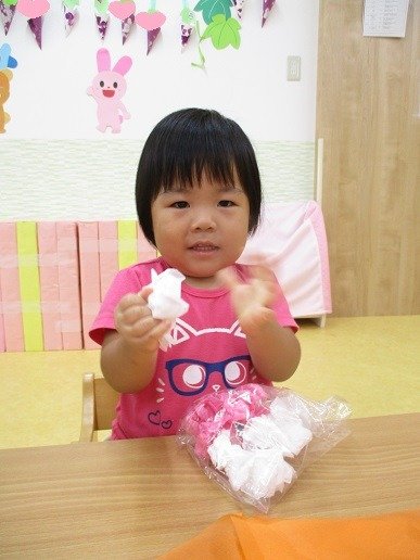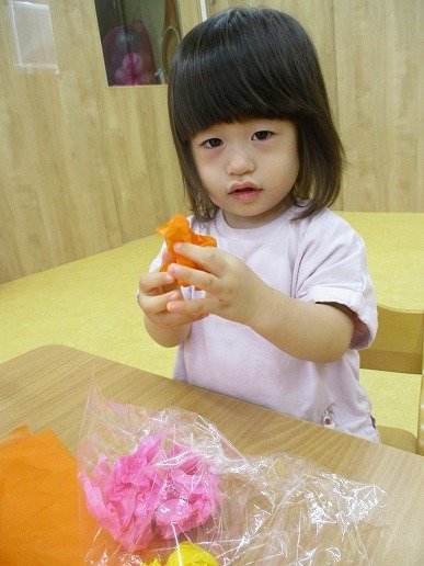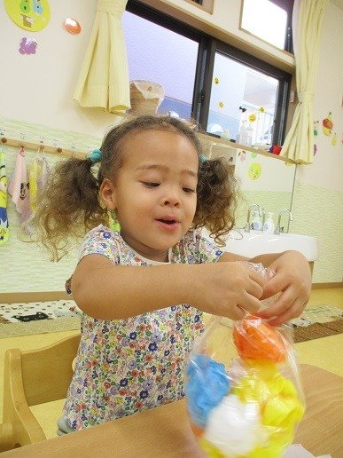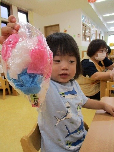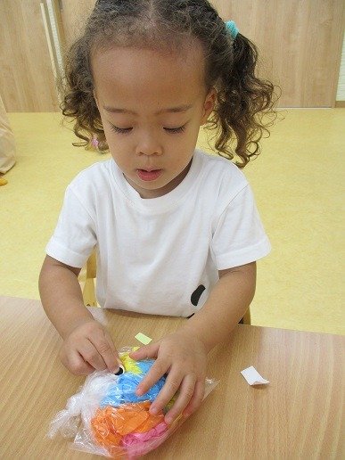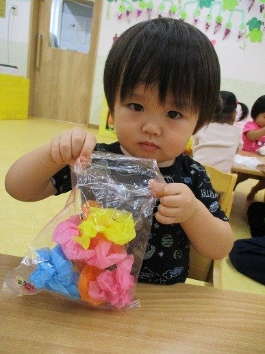 カラフルな花紙を袋に詰めて…