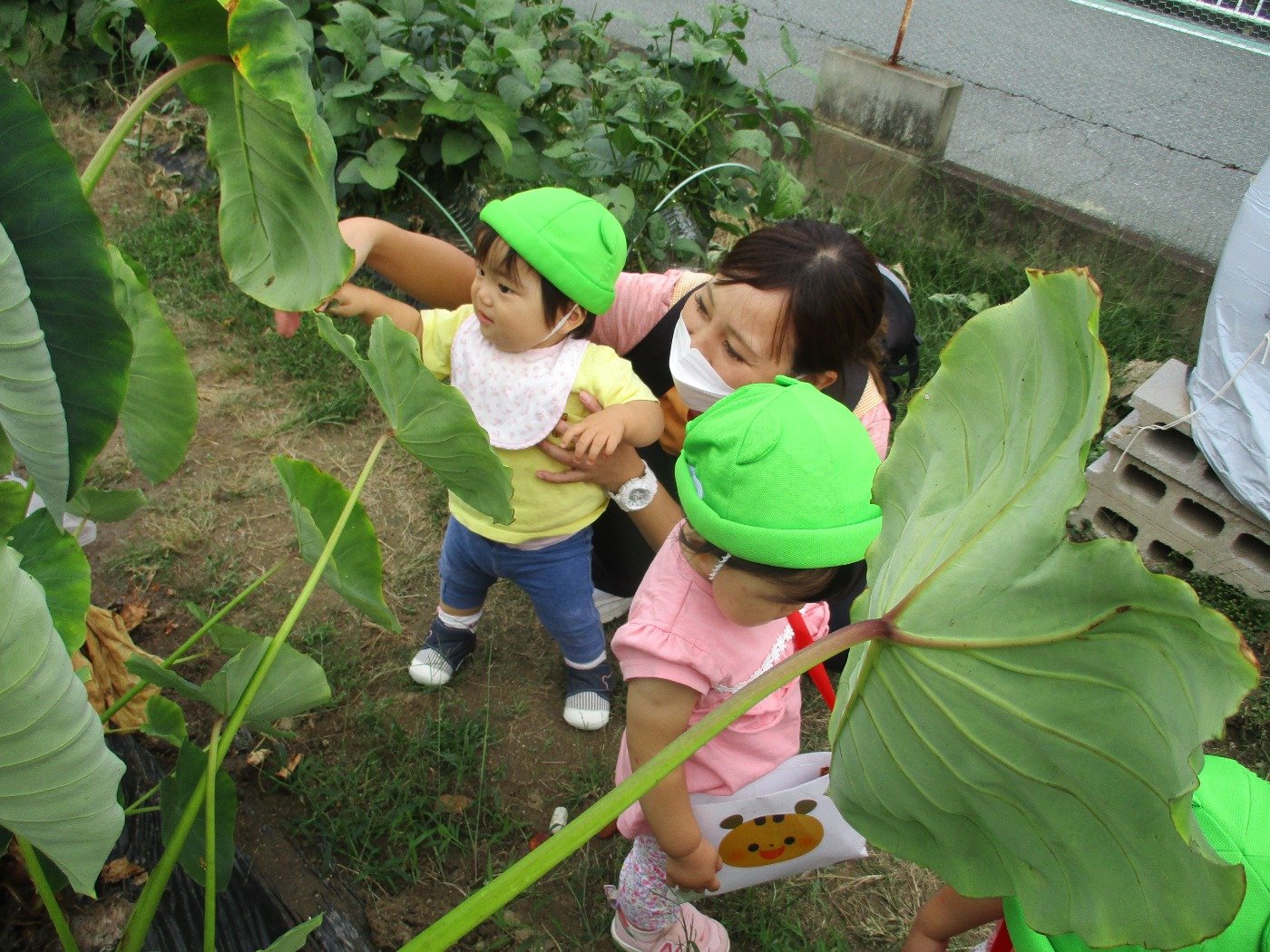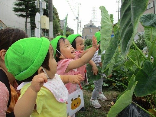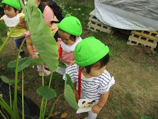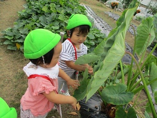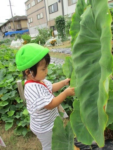 畑の里芋の大きな葉っぱに