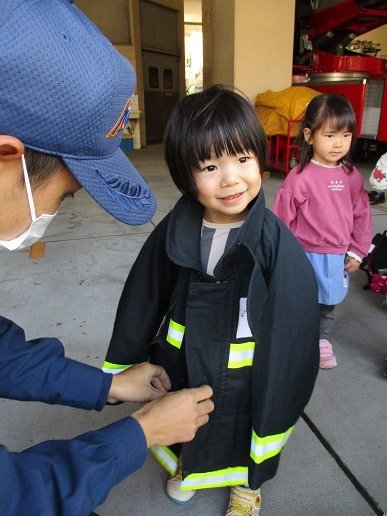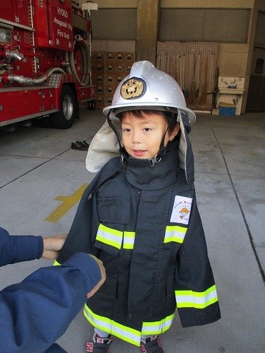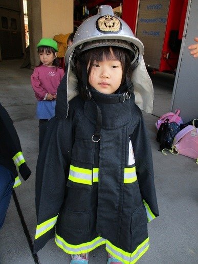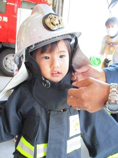 消防士さんの服を着て