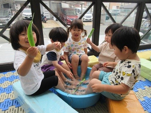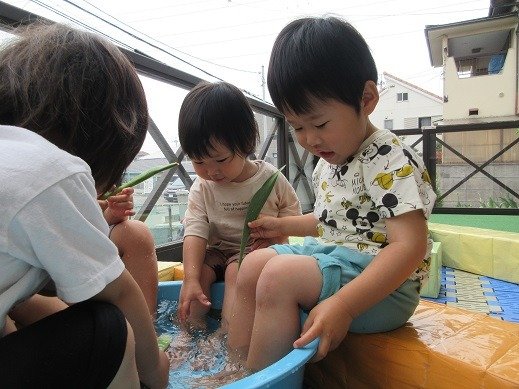 タライにしょうぶを入れた