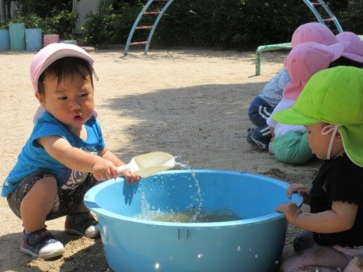 タライに水を入れている