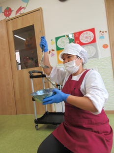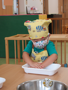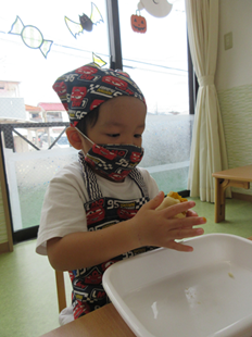 エプロンをつけて、消毒をして