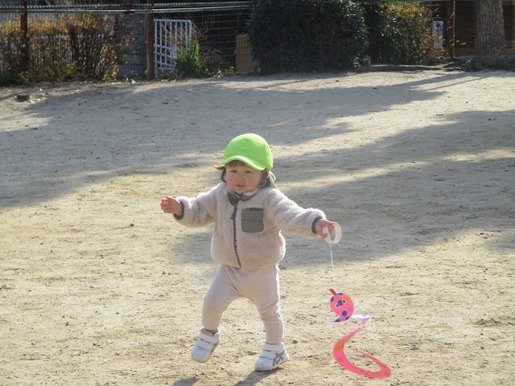 糸を握って嬉しそうに