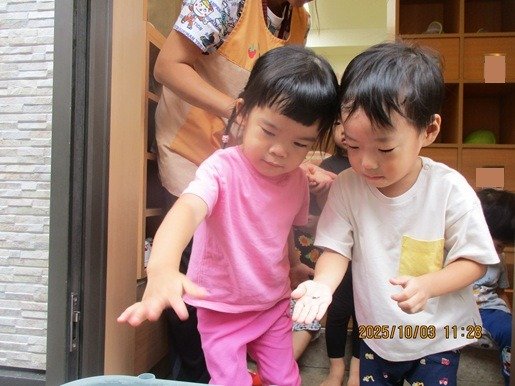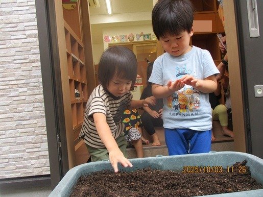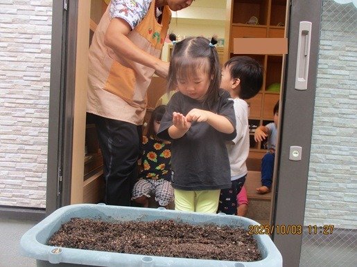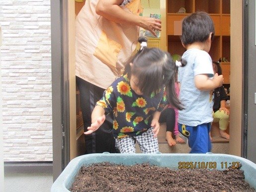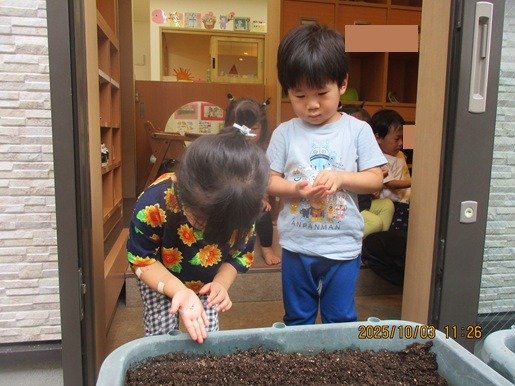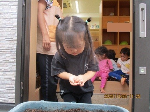 ☆2025年10月のきらきらっこ☆①コカブの種まきをしたよ♪ ホームブログ 2025.10.03 コカブの種まきをしたよ♪ 10月3日(金)☔ 朝は曇りだったのに、 外へ行こうとしたら。 雨がポツポツポツ… あらら…残念! でもね、プランターを 玄関前まで持ってきて コカブの種をまきました。 小さな種を、手の平に 置くと、小さな種を つまんで上手に撒いて いましたよ♪ 「大きなかぶ」の 話のように、 あまーいあまーい カブがたくさん できますように(*^^*)