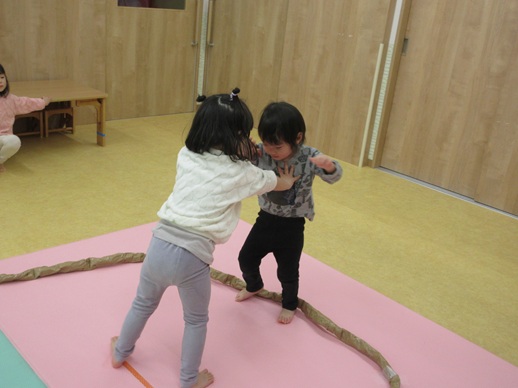 保育者をチラッチラッと見て…土俵の外に押し出し~!