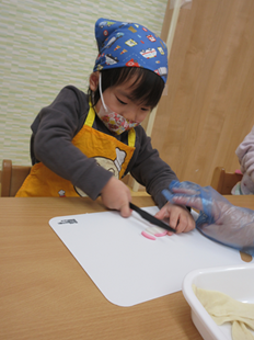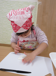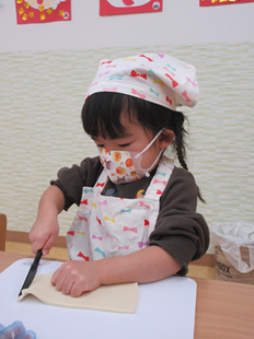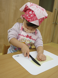 こども用ナイフで、切り切り…