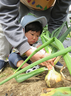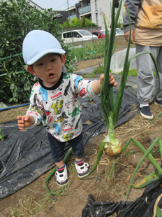 ☆2026年4月のきらきらっこ☆④玉葱収穫NO.2 ホームブログ 2026.04.21 玉葱収穫NO.2 4月21日(火)☀ 昨日お休みしていたお友達が玉葱収穫! 大きな玉葱を不思議そうにみつめながら 先生と一緒にうんとこしょ! 収穫した玉葱を片手で持ちながら 「何かな?」の表情…重かったけれど しっかり持てたね✨