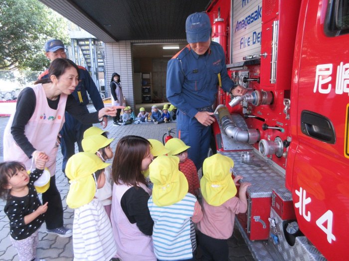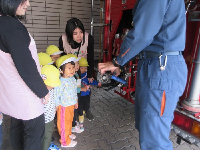 水消火器の練習や、消防車の見学に興味津々です。くま組さんは、消防車の色々な部品を