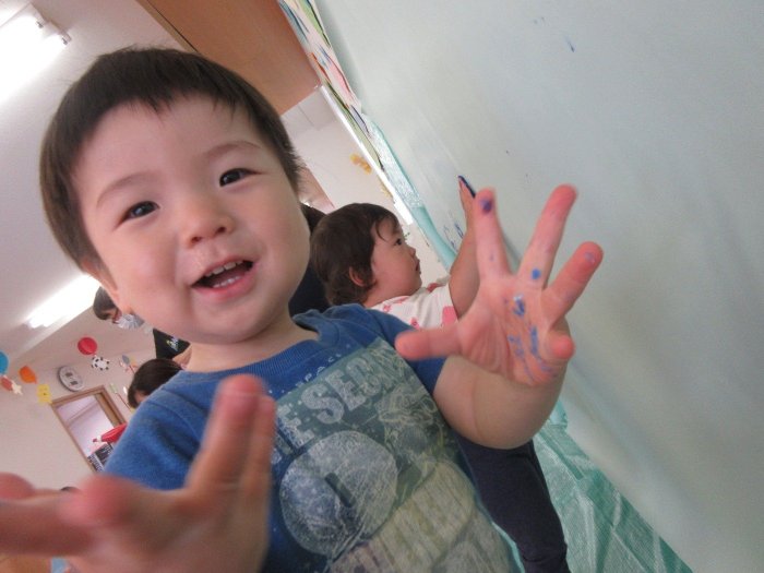 どうぞと手渡すと、やったーとばかりに絵の具を付けて