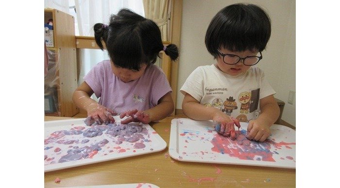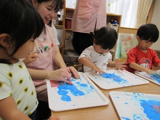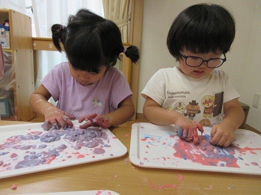 ピンク色のトロトロと、水色のトロトロ。「ピンクもほしい?」「〇〇ちゃん、ピンクちょっともらっていい?」先生に聞いてもらって上手に分けっこしてくれます。自分の分や気持ちを大切に保障されていることで、きっと安心しているのでしょうね。
