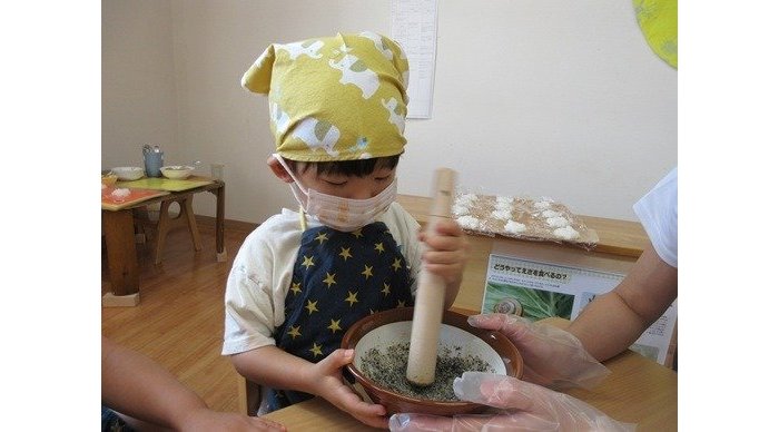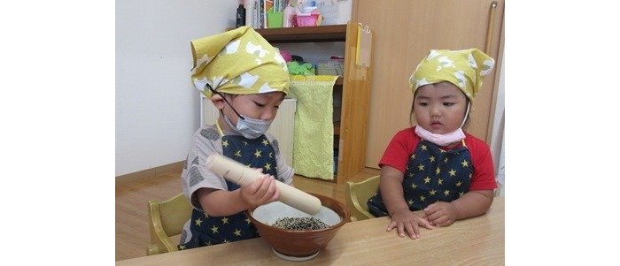 大きなすり鉢をすりこぎを使って、ゴマをすります。ゴリゴリ ゴリゴリ。とってもいい香りがしてきて、早く食べたくなっちゃったね。でも、グッと我慢。