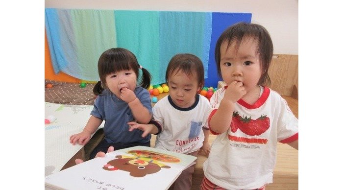 絵本を見ているお友達。「あ~ん。パクッ」かわいいしぐさがいっぱいです。おいしそうに食べるお顔がたまらないですね!