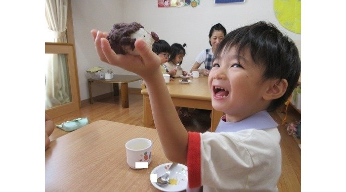 3時のおやつはお月見団子。ハリネズミのかわいさにこの笑顔。「かわいいから食べれな~い」なんて手のひらにのせてかわいがっていました。喜んでくれて先生達も嬉しいな。
