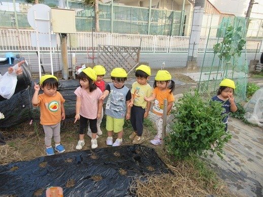 種まきをした大根の小さな芽は、バッタさんがむしゃむしゃ食べちゃったみたいで「ハートの葉っぱがないね」と教えてくれました。子どもたちは本当にいろんなことによく気がつきますね。