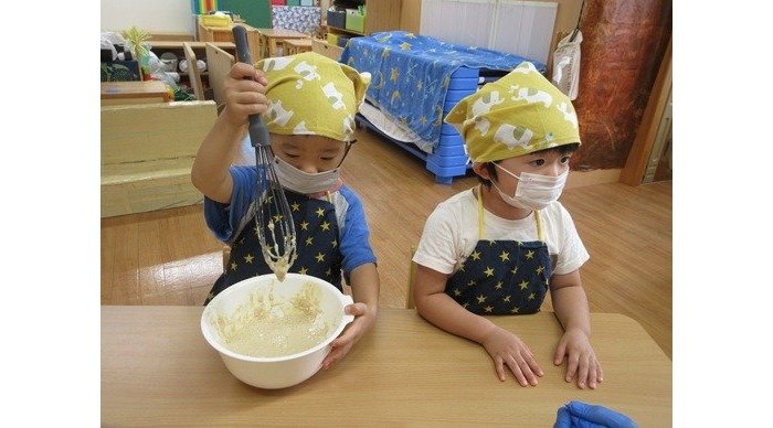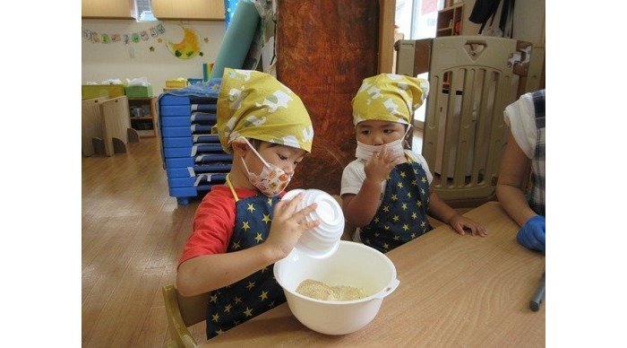 くま組さんはクッキングもしましたよ。今月のクッキングは小麦粉から生地を作っていきます。