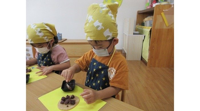 焼けた生地にあんこをのせますよ。たっぷりのせたらおいしいよね!