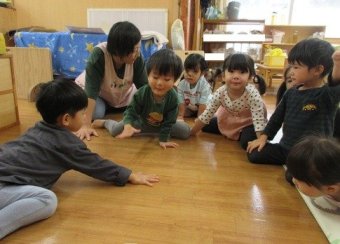 地震・津波の避難訓練を行いました。だんごむしのポーズが良い時もあればそうでない時もあるようで、今回は『カエルのポーズ』を覚えました。手のひらをしっかり開いて床にペタリ。足も開いて踏ん張るポーズです。