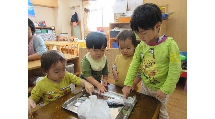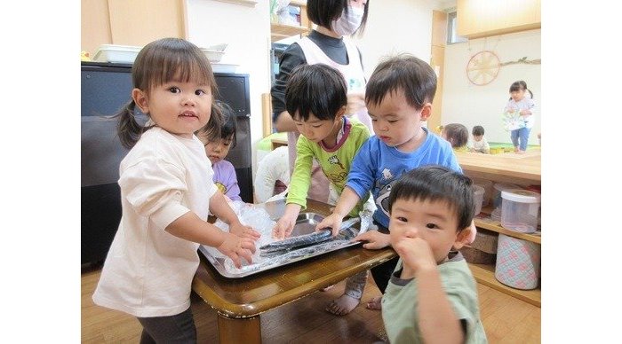 くま組さんは、サンマを焼いてみました。お部屋がいい香り~。ホットプレートの蓋をとると、「うわぁ~」と子どもたち。