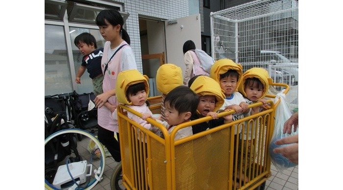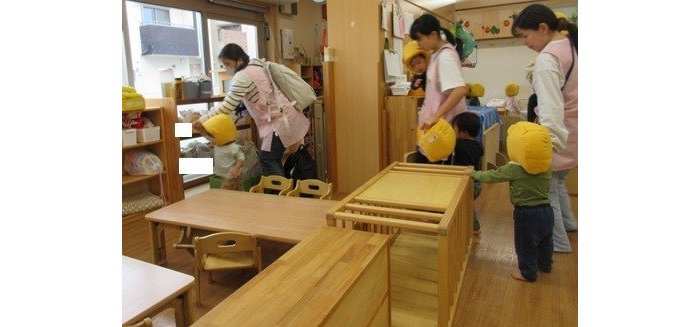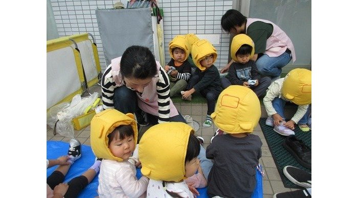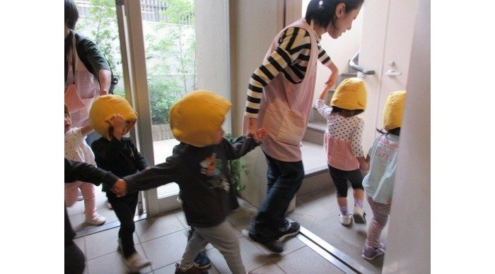 揺れがおさまったので、防災ずきんをかぶり保育園の外まで出ます。
