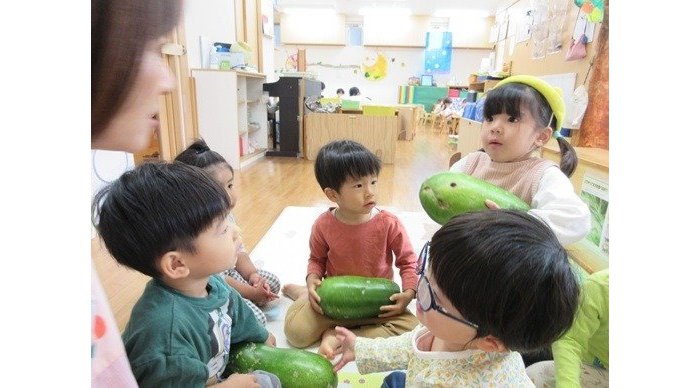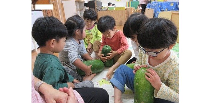 「これなぁに?「かたいよ」子どもたちが興味津々で集まり、叩いてみたり匂いを嗅いでみたり、抱っこしてみたりしているうちに、