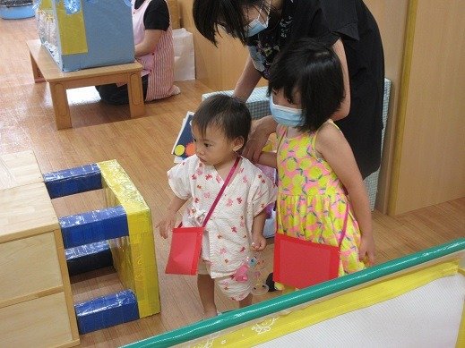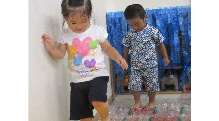 トンネルや滑り台。卵パックの上を歩いたり、子ども達が作った川に、はまらないように一本橋を通ったり、
