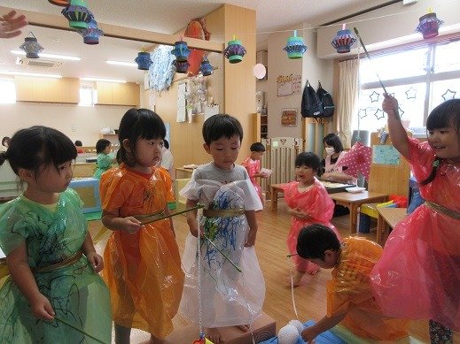 くまぐみさんは、自分たちで作った浴衣(のつもりでしたが、子ども達は「ドレス素敵でしょー」って笑)を着て参加。