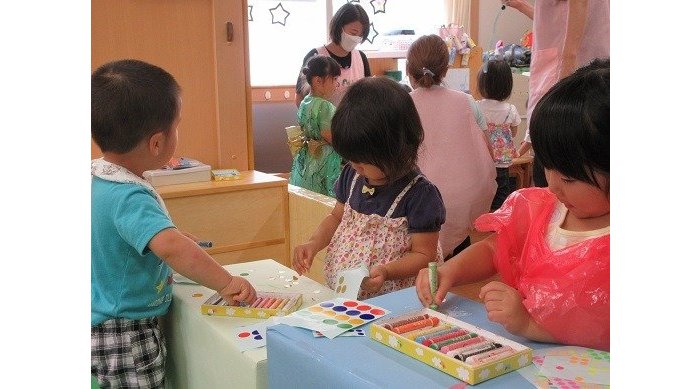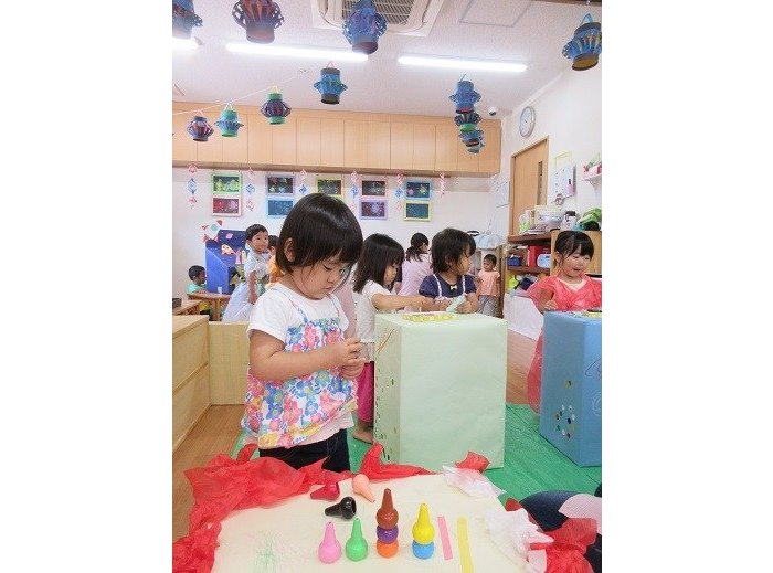 製作コーナーは 大きな段ボールが4つ。一つは、お花紙をペタペタ貼り付けるもの。後はシール貼りや、クレパスを使って、お絵かきができるように準備してあります。シール貼りが大好きなお友達が、集中してペタペタ。