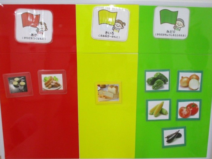 お調理の先生から三大栄養素のお話しを聞きました。ピーマンは体の調子をととのえる緑色のグループ、チーズはみんなの体をモリモリ元気にする赤色グループ、パンはみんなの体が大きくなるように力がたくさんつく黄色のグループ。ピザ作りに使う食材がそれぞれどんな栄養があるのか三大栄養素のボードを使ってお話をしてくれたので、子どもたちも興味津々で聞いていましたよ。