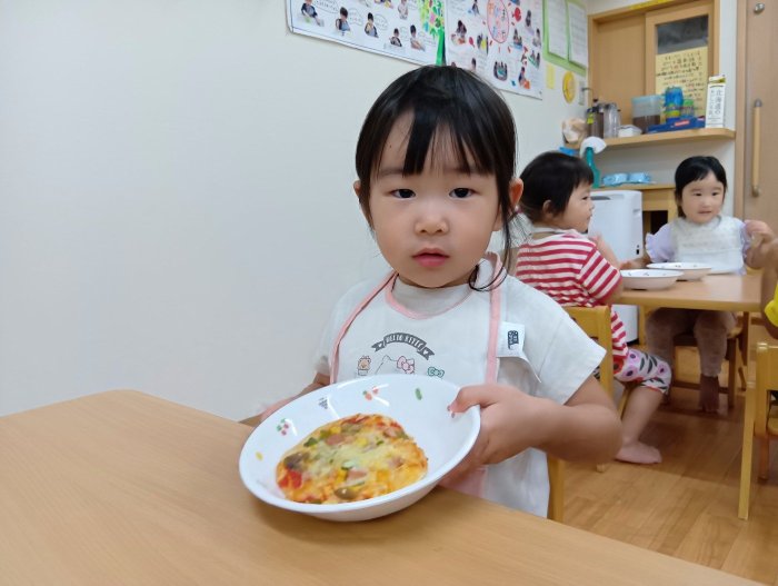 午睡後お調理室からいい匂いが・・・そうそう!みんなが作ったピザをお昼寝中にお調理の先生が焼いてくれました。
