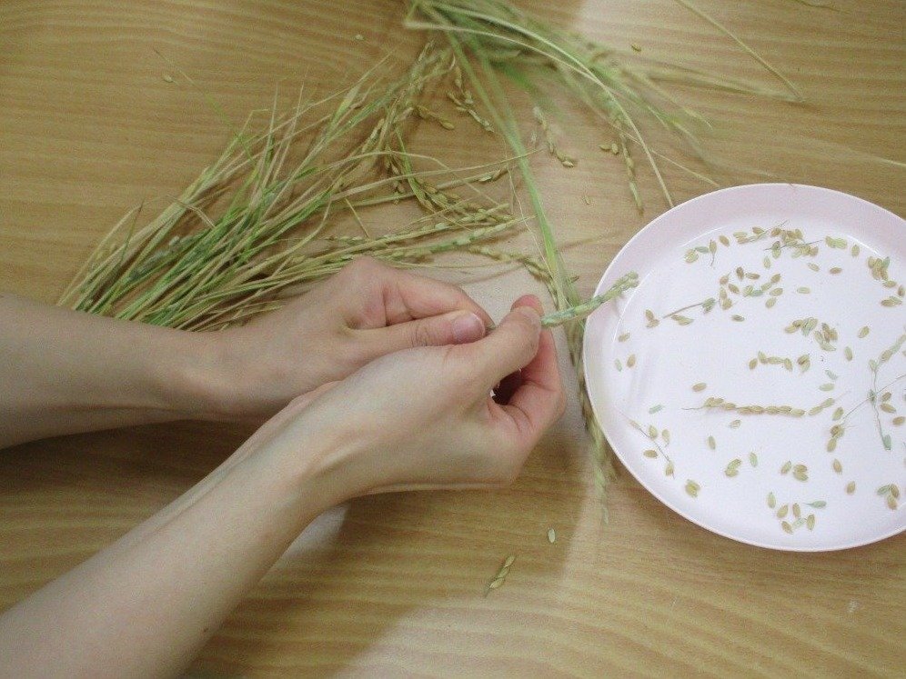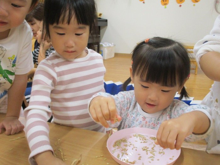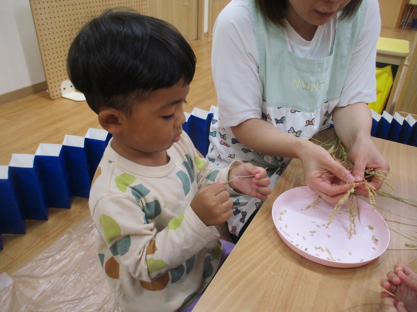 稲刈り後、園の小窓にぶら下げ乾燥、脱穀は保育者でし籾すりは子どもたちにお手伝いしてもらいました。「おいしいお米にな~れ🎵」なんて言いながら袋の中に入れた稲穂をすりこ木で「トントン」「おいしいお米にな~れ🎵」なんてねおまじないをかけながら楽しく籾すり体験をしたよ。
