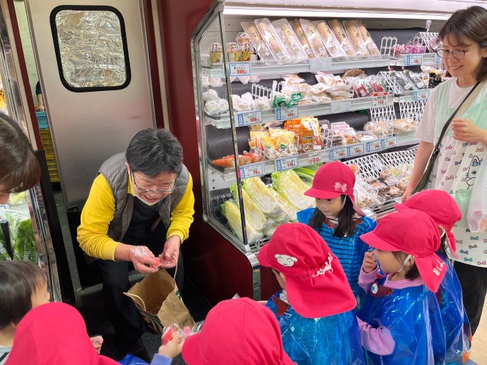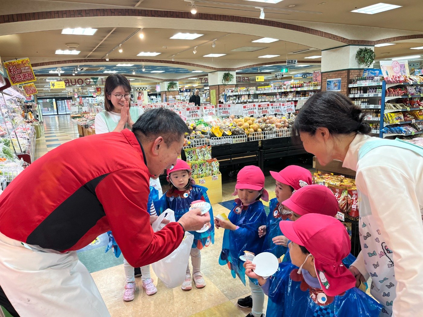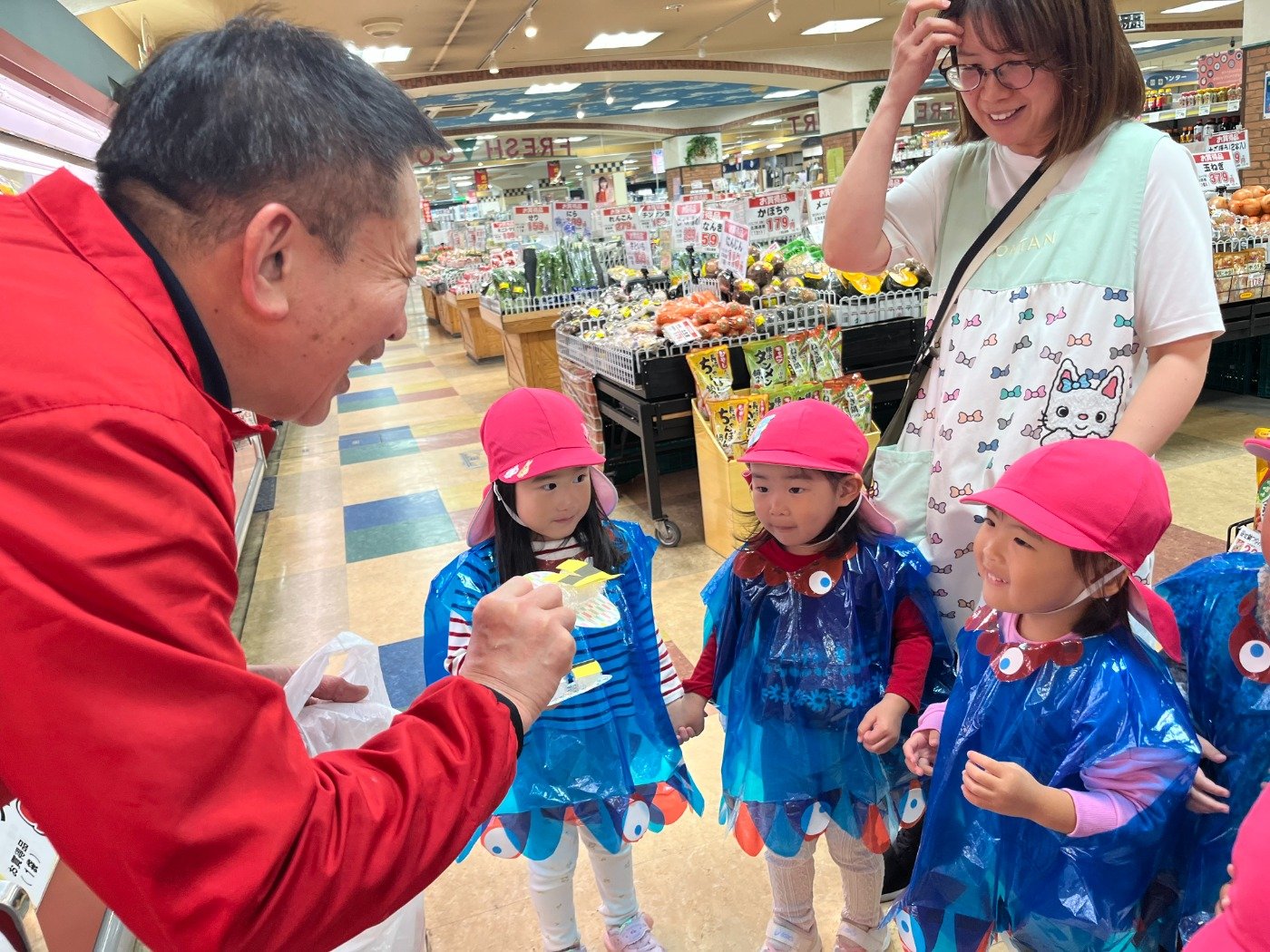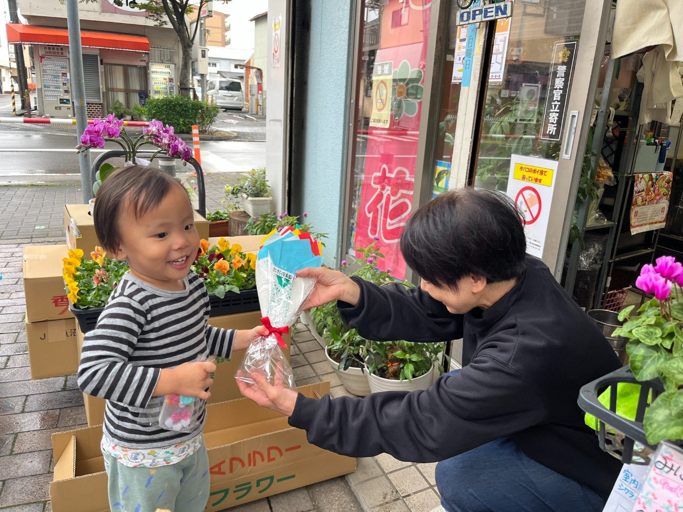 *お店でいただいたプレゼントは、全て子どもたが制作したものを事前にお店の方々にお預けしていたものなんですよ。お花屋さんには折り紙で制作したお花、お肉屋さんにはフランクフルト、お魚屋さんにはタコとお寿司、野菜屋さんには粘土で作ったトマト、カフェのお店にはスポンジで作ったケーキ・おはながみを使って作ったジュース。どれも世界に一つしかない作品です😊
