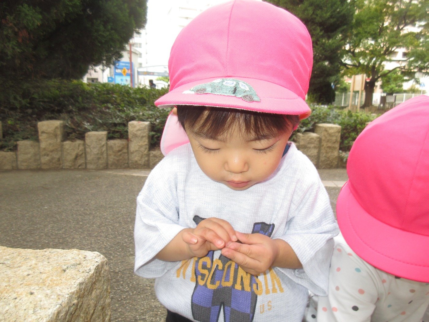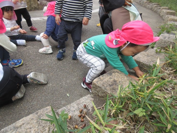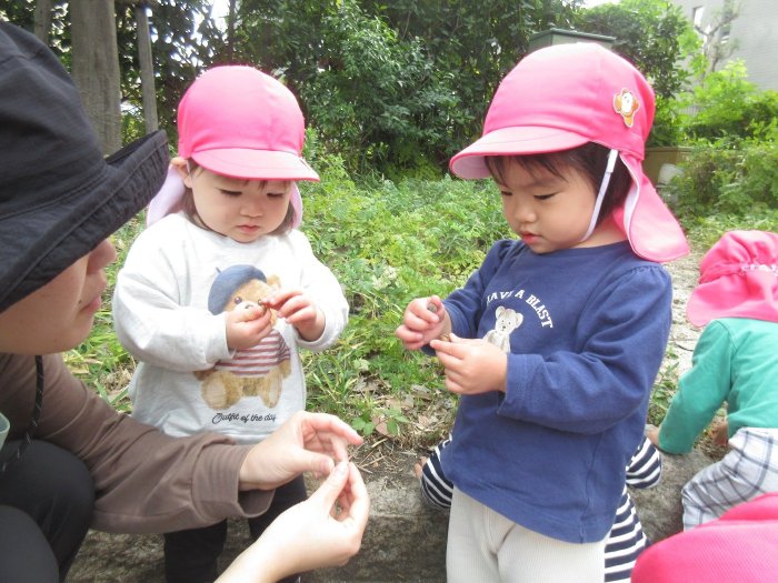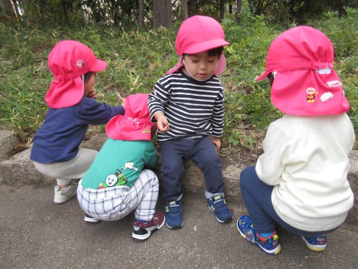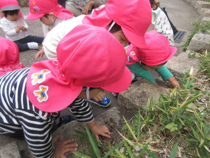 保育者がどんぐりコロコロ🎵を口ずさむと、子どもたちの探索スイッチが加速したかのように腰を低くして草むらの隙間をのぞき込んでいると「あっ!!」と何かを発見したようなお声が聞こえました。