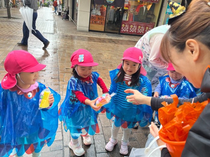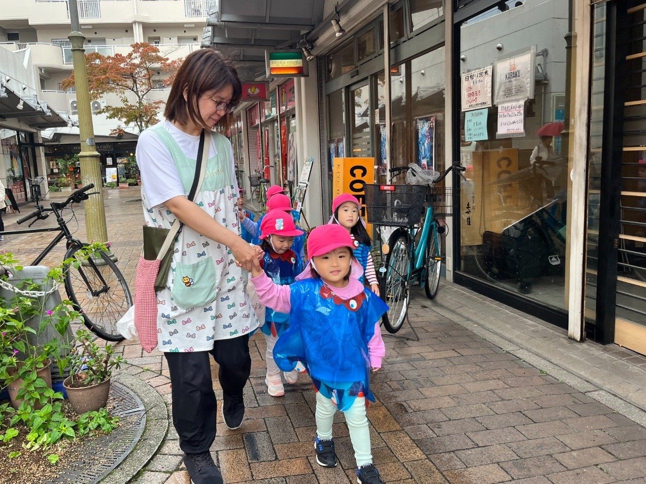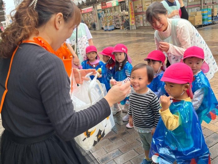 先月の終わりハロウィン行事をしました。季節ごとに商店街の装飾も変わるので季節を感じられるお散歩。道中も楽しみがいっぱいです。