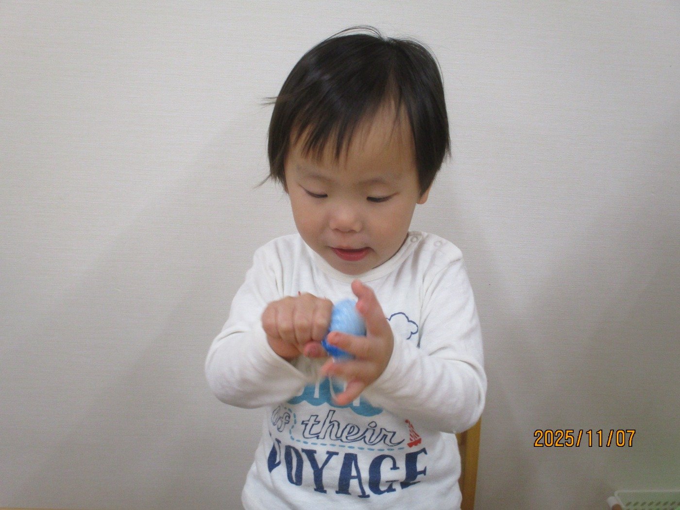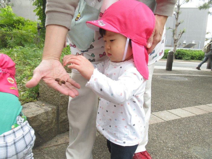 どれどれ?と集まってきましたよ。小さなお手々にそーっとどんぐりをのせたり、指先でつまんでじーっとみたり。