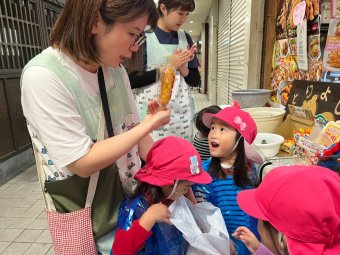 商店街の装飾が変わっていることにいち早く気がつく子どもたち。「かぼちゃ、ないねー」「おばけ、いないねー」とあちこち周りを見ながらぶらぶら散歩。