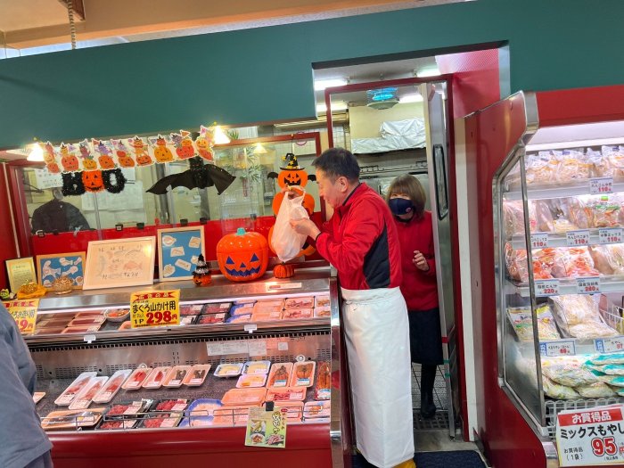 スーパーの中に戻って、お魚屋さんとお野菜屋さんにご挨拶。お魚屋さんの店主さん、いつも楽しい仕掛けをしてくれてね。合言葉を伝えると、なんとデイスプレイしてあるかぼちゃのバケツからプレゼントを出してくれたよ。