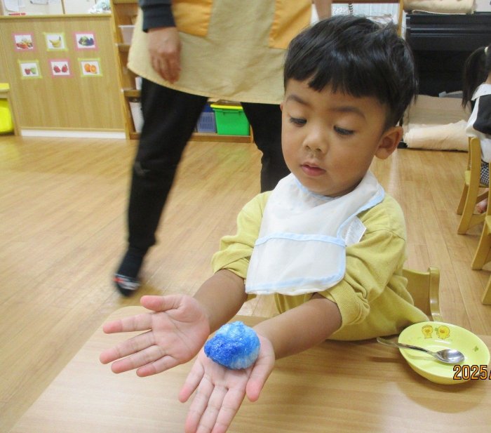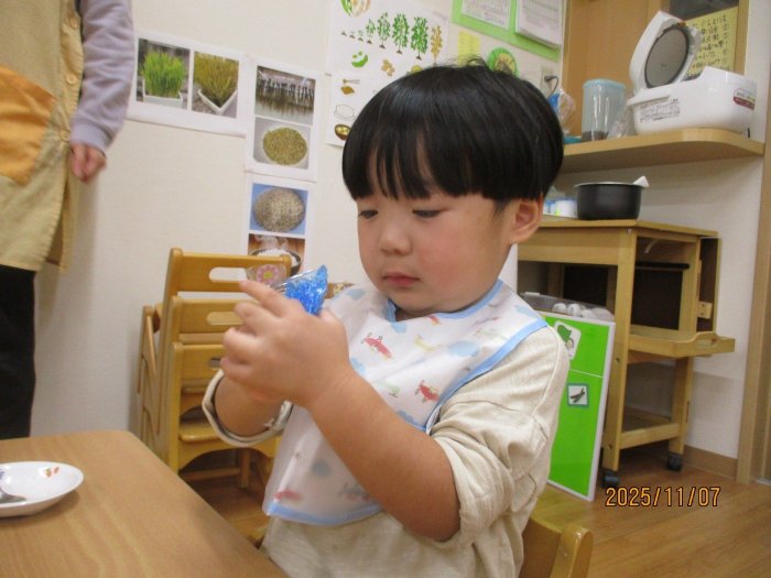 だいじに大事に育てたお米が完成し、今日はおひさま組は自分でおにぎりを作っていただきました。まんまるおにぎり、でこぼこおにぎり、いろんな形のおにぎりの完成!どれもおいしそう!「あまいね~」「おにぎりさいこー」なんて嬉しいお声が聞こえていました😊