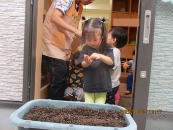 ☆2025年10月のきらきらっこ☆①コカブの種まきをしたよ♪ コカブの種まきをしたよ♪ 10月3日(金)☔ 朝は曇りだったのに、 外へ行こうとしたら。 雨がポツポツポツ… あらら…残念! でもね、プランターを 玄関前まで持ってきて コカブの種をまきました。 小さな種を、手の平に 置くと、小さな種を つまんで上手に撒いて いましたよ♪ 「大きなかぶ」の 話のように、 あまーいあまーい カブがたくさん できますように(*^^*)