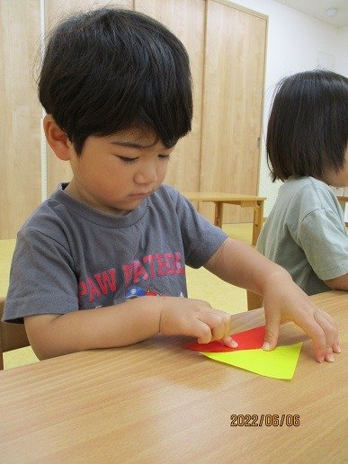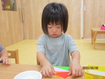 ☆2022年6月のきらきらっこ☆②梅雨を前に…制作編♪ 梅雨を前に…制作編(^^♪ お部屋では、七夕の制作🎋 ペタペタと楽しそう♪ 来月のおまつりに向けての 制作にも取り組んでいます。 全身を使った塗たくり遊び♪ うさぎ組さんは、情熱の赤! ヌルヌルペタペタ いい気持ち(*^^*) さて、何ができるかな? くま組さんは、自然の緑! 駐車場でのびのびと 楽しみました(*^^*) どんな作品に変身するかな? 笹飾りは、七夕の日に 持ち帰ります。 どうぞお楽しみに♬